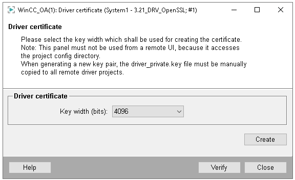 The driver certificate window can be used to change the certificate used for encryption driver-related passwords or other sensitive information to be stored on internal DPs. If the certificate is not changed, a default certificate will be used, which is not secure because the private key is part of the WinCC OA installation. To be on the safe side, a certificate should be generated after the project has been created. It is important to note that changing this certificate will invalidate any encrypted information stored on internal datapoints.