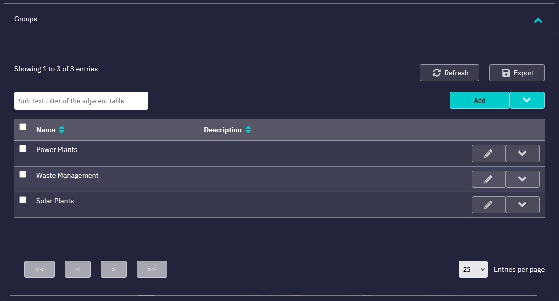The Groups section lists all subgroups contained within the currently selected main group. New subgroups can be created and administered here.