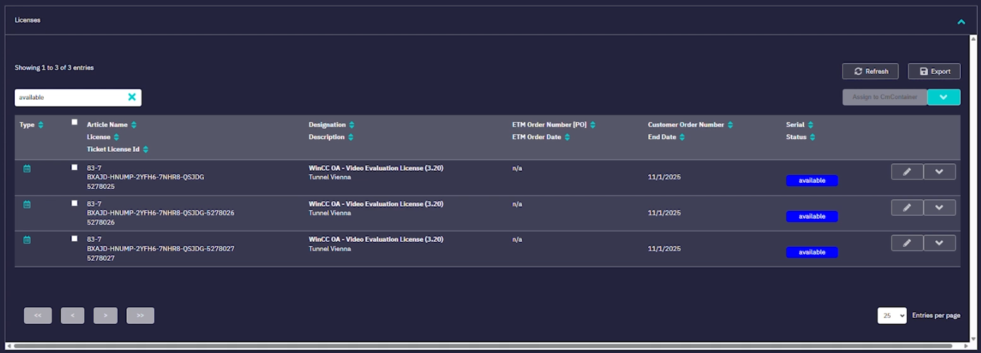Assigning licenses to a virtual container in the WinCC OA License Portal enables pre-packaging of license options for remote deployment. This process streamlines license preparation for off-site technicians or service personnel, ensuring efficient and organized distribution.