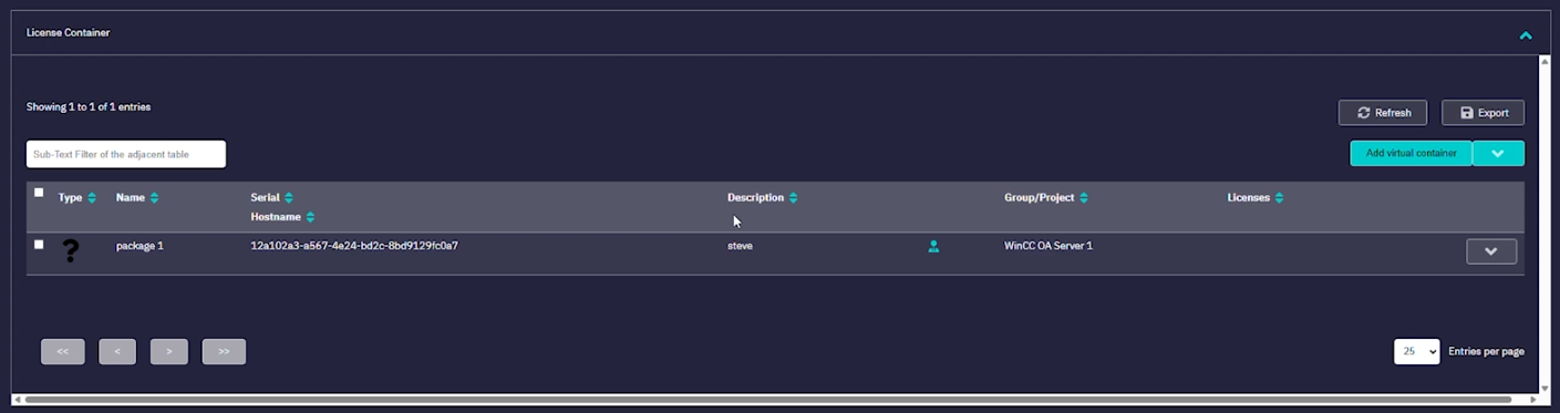 Navigate to the license container section to see your new virtual container, complete with a serial number and description. This ensures the intended recipient (e.g., Steve) can identify and deploy their licenses.