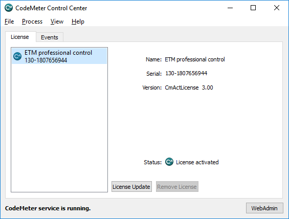 Note:that the entries in the CodeMeter Control Center are shown only after you have bound the licenses to a software container or to a hardware container (dongle).Note:The CodeMeter Control Center shows the license containers available on the local computer.Figure 2. CodeMeter Control Center