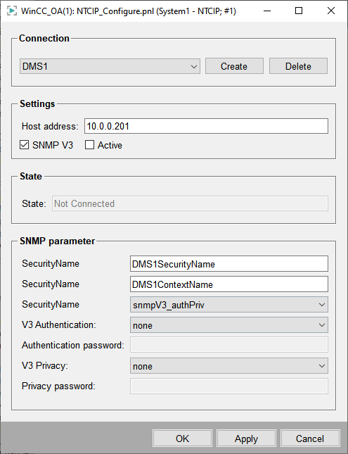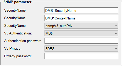 If an SNMP v3 DMS shall be connected, the corresponding checkbox must be selected. The Host address must be filled out as well as the V3 SecurityName and