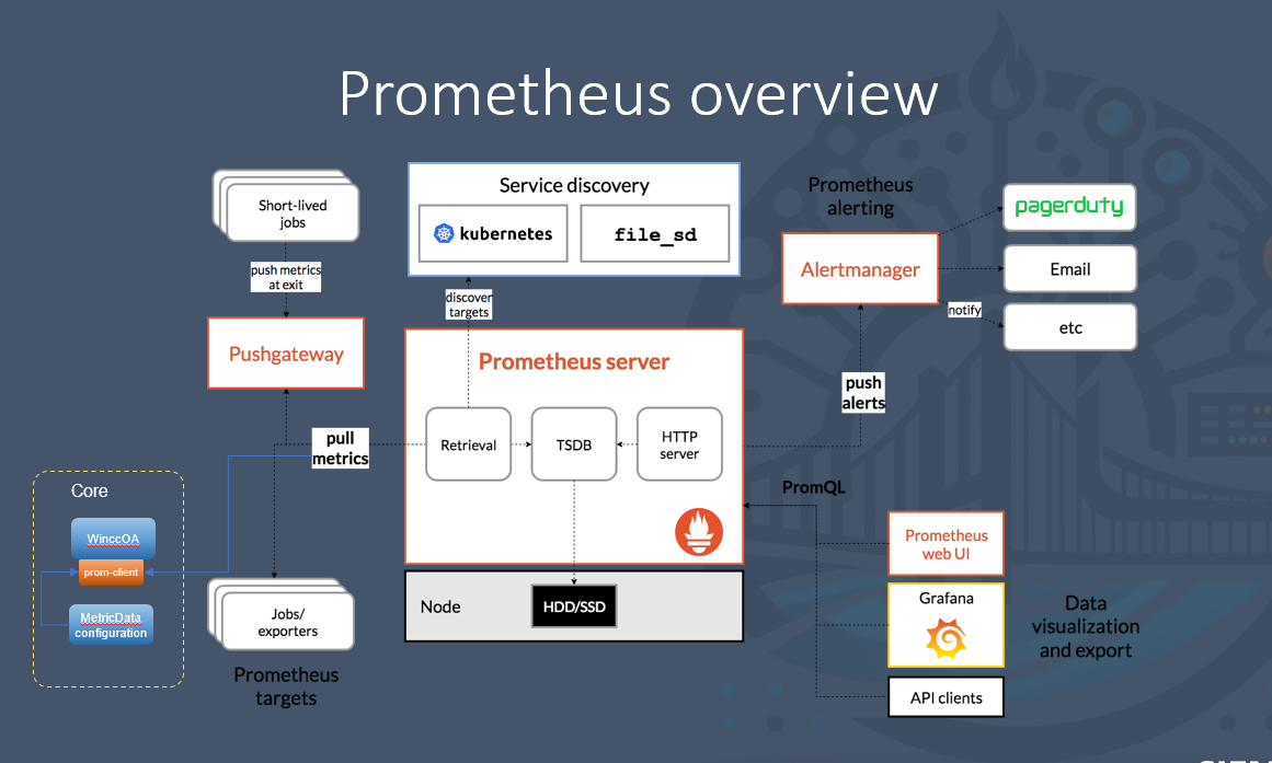 The Prometheus interface (also referred to as Prometheus client) serves as a bridge between WinCC OA and Prometheus. It facilitates the retrieval, processing, and exposure of data from the WinCC OA system to a Prometheus-compatible format. This allows Prometheus to monitor and alert based on the data fetched from the WinCC OA system.