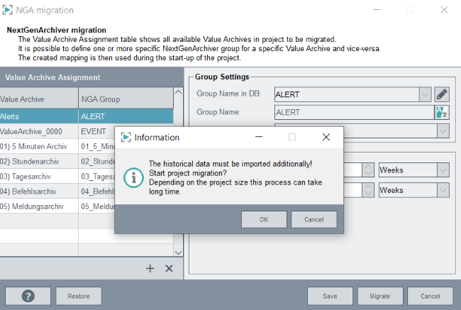 Click on the Migrate button to start the Migration. An information about the historical data is shown (see figure below). Click on OK