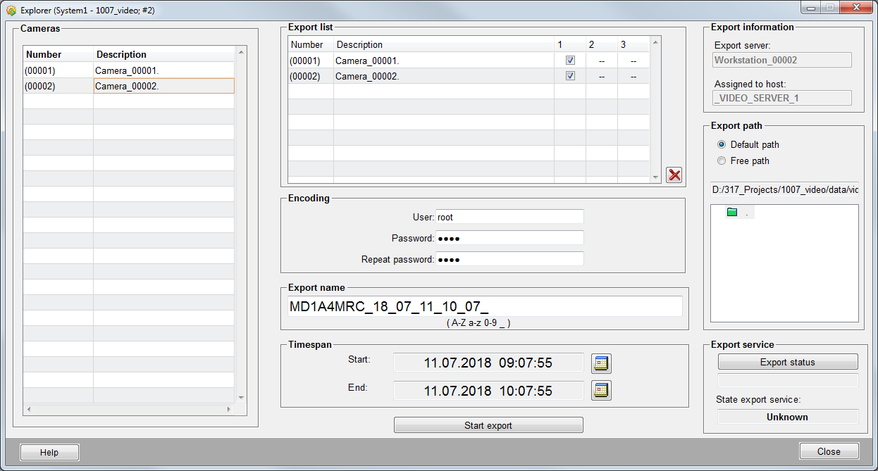 The predefined time range and a camera are passed to the dialog when starting the export dialog via the playback handling. It is the camera from whose playback handling the export dialog was started. If the export dialog is started via the export overview panel no camera is predefined. CamerasAll cameras for whom a recording exists for at least one configured stream are shown in the camera tree on the left side. The camera number and the description text are shown in the columns number and description. The cameras can be added to the export list per drag & drop. Export listAll cameras meant for the export are listed in the export list. Camera number, description text and information for which streams recording is available are displayed in the table. Those values cannot be edited. With the Shows the selected export server as well as the assigned host. Export pathIt is possible to choose between default path or free export path. With default path the export path configured in the workstation or a sub directory within this path can be defined as destination for the export. Exports in this directories can be managed with the file overview. With the option free path an arbitrary destination can be specified for the export. EncryptionIf the data shall be exported in encrypted form, a user and a password must be defined. The exported video data can only be opened with the provided player and only after entering the defined user name and password. Export nameThe export name is automatically generated when opening the panel. The export name is the later folder name of the export and is structured as follows: [host name]_[year]_[month]_[day]_[hour]_[minute] The export name can be manually changed. Following characters are allowed: A...Z, a...z, 0...9 Time rangeAllows to modify the predefined time range for the export task. Export startThe export is started with this button. Export statusShows the current export status of the workstation. With the export status button a more detailed status overview of export tasks is displayed.