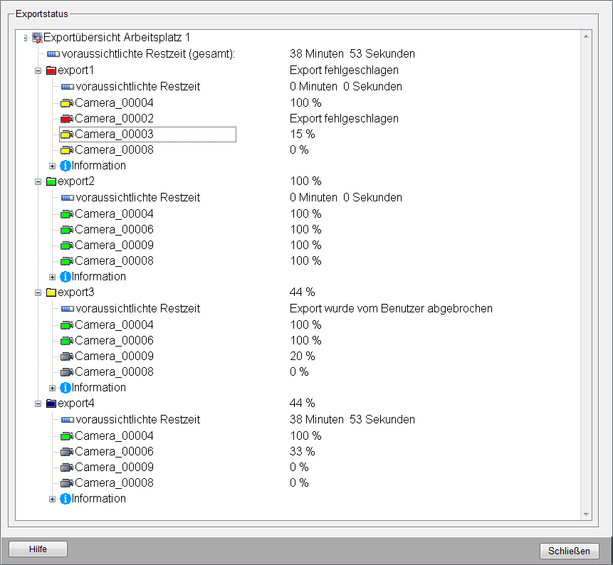 The following color and text indication are possible for the export status: Status export1: This export has failed. The export must be removed from the list by the user. Camera 4 is completely exported. An error occurred during the export of camera 2. The export of camera 3 is 15% completed. The export of camera 8 is 0% completed. Status export2: This export is completed and will be automatically deleted with the next status update. The export of camera 4, camera 6, camera 9 and camera 8 is 100% completed. Status export 3: This export was cancelled by the user. The export of the data is 44% completed. The export must be deleted from the list by the user. Status export 4: This export is currently running. The export is 44% completed, the estimated remaining time is 38 minutes and 52 seconds. The export can be cancelled by the user. Camera 4 is already finished. The export of camera 6 is 33% completed. |