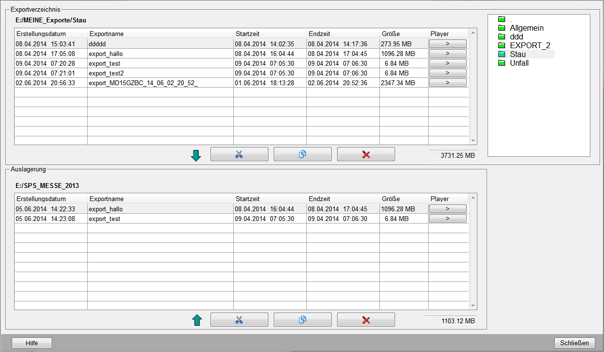 The single export directories can be selected via a file selection tree. Directories to which access is currently not possible are displayed green. Directories to which no access is possible are displayed red. External export directoryThis directory is defined during the workstation configuration. The directory can be used to e.g. provide export files for a DVD burner. With the > button the player is started with the selected export. Under the table there are three buttons that are used for the file management: