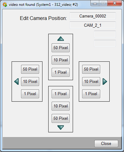 This option only deletes the camera in the process image, so it is still existing in the system. Change camera positionThis option opens a dialog which enables to change the position of the camera. At the top right side of the dialog panel the name of the camera and the reference as well as the current position are displayed. You can move the camera by 1, 10 or 50 pixels to the desired direction with the appropriate buttons.