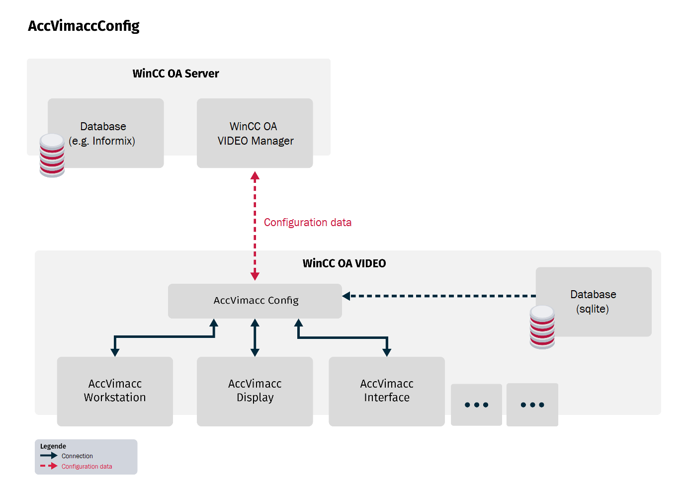 This service is the central database service for the whole configuration of a WinCC OA video system, its control and its system state. AccVimaccConfig is able to read the static configuration data from a local data base. The input data is provided for all processes of the WinCC OA video system.
