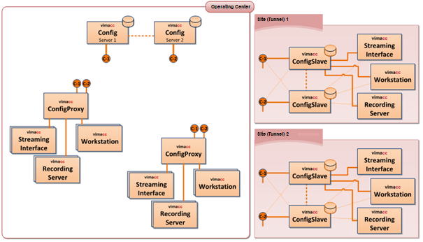 A distributed video system can be divided in different segments (sub nodes). The AccVimaccConfigSlave bundles the interprocess communication necessary for the management and buffers it locally. Therefore, in case of a communication loss (e.g. connection to central management servers is lost) the operability of the respective sub node is still ensured locally. As a result, you can configure recording or streaming nodes with connected vimacc workstations or display servers which will be working independently in case of network problems.