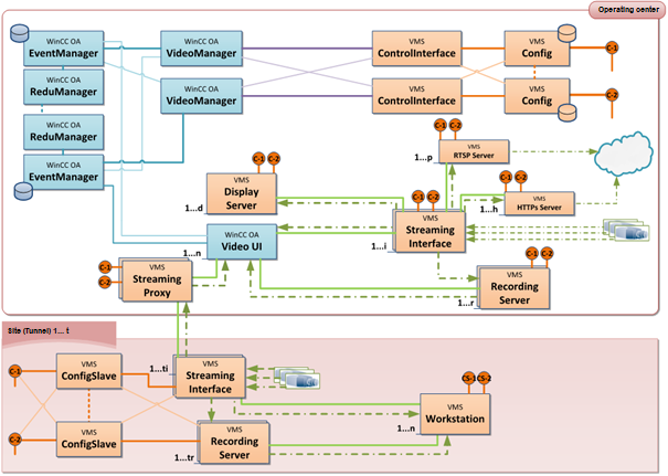 WinCC OA Video consists of several components with different responsibilities. It is possible to run these components on one single computer or distributed on several computers in case of large systems. Together these computers form the WinCC OA Video System.