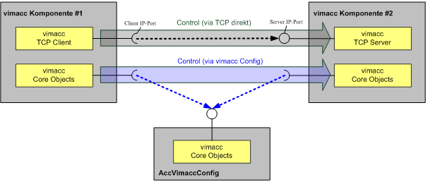 Communication via AccVimaccConfig: The communication via AccVimaccConfig is a mechanism provided by each component's application framework. The application framework communicates with the AccVimaccConfig component via IP connections and ensures that the AccVimaccConfig is always available as data base for the application. Therefore, each video application can retrieve the relevant control commands from the AccVimaccConfig and deposit control commands and status information. Usually a logic control connection between two components is accomplished via the AccVimaccConfig.