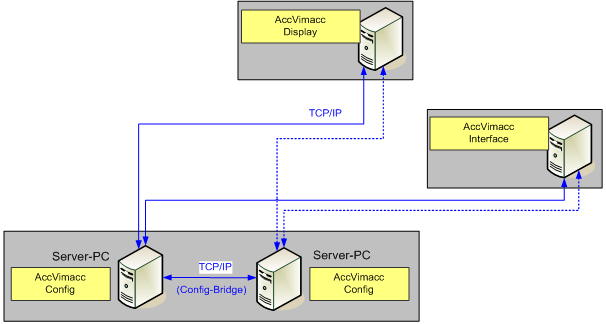 In case of a hot standby system (consisting of two running AccVimaccConfig processes on two different hosts) all software components are communicating with both AccVimaccConfig processes via separated TCP/IP data connections.