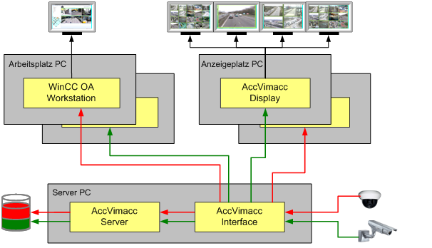 AccVimaccDisplay is responsible for the video output via multi channel monitors and large screen displays. The component is operated on one host which operates a display unit via one or more graphics adapters. A display unit consists of e.g. monitors, video projections or large-format screens with graphics controllers. Depending on the number of necessary video channels which shall be displayed simultaneously, one or more display workstations are necessary for a WinCC OA video system.