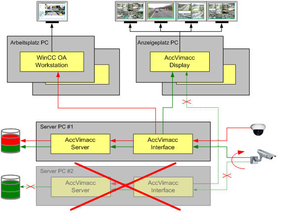When the connection to the central management server is lost, the vimacc components for recording and streaming as well as the vimacc workstation for visualization and operation are still available for the sub node.