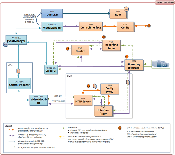 All software components of the WinCC OA video system can communicate with this service via TCP/IP in order to query system configuration and system state, to transmit their own state and react to commands.