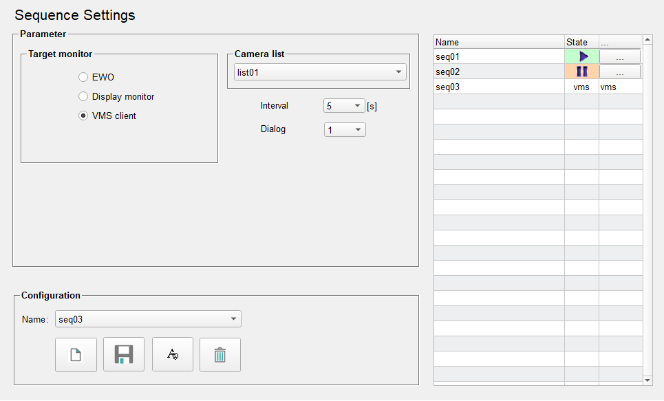 Parameter Description Name One of the existing display monitors must be selected via the combo box. Interval Time in seconds after which the sequence proceeds to the next step. Dialog Dialog of the display monitor (1-24) in which the stream shall be displayed. The application must provide the corresponding grid setting. - VMS configuration