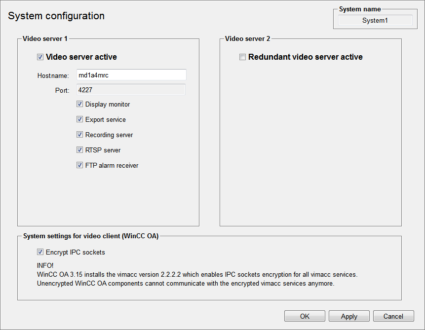 Select the System configuration entry to define on which computers the underlaying video system shall run. Moreover you have to configure if it shall be a single or a redundant system.