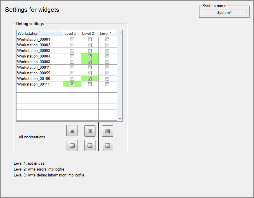 For video widgets which are used for displaying video streams, different debug levels can be selected for each workstation. A video widget provides 2 different debug levels which can be activated or deactivated independently of each other. The debug levels can be set for individual workstations via the appropriate buttons. The debug levels bring the following outputs: Level 1: Currently not in use. Level 2: Error messages are written to the log file of the user interface. Level 3: Debug messages about the current operating status are written to the log file of the user interface. |
