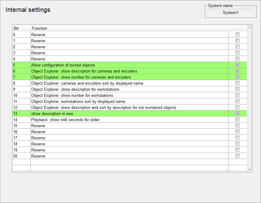 System internal options can be enabled or disabled with the respective check boxes on this panel.