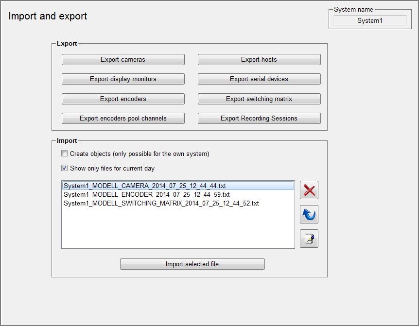 The data is exported to a text file. Each configuration of an object is saved in a column of the file. A tab character is used as separator between the columns. The export for each configuration is started by the appropriate button (camera, display monitors, encoders, serial devices) and is saved under <WinCC_OA_Proj>/data. The files are named by default in the following way: <System name>_MODEL_<object type>_<year>_<month>_<day>_<hour>_<minute>_<second>.txt ImportTo import a saved configuration you have to select a file in the selection box. If you enable the create objects checkbox, objects of the file that do not exist in the WinCC OA data base are also created. This function can only create objects on the local system. If the checkbox is disabled, only configurations of existing objects will be imported. Structure of the filesThe export and import files are structured in the following way: The first row is meant for comments (they are ignored in case of an import and generated automatically in case of an export). Each successive row contains one video object. The first column contains the system name of the datapoint. The second column contains the name of the datapoint type of the datapoint. The third column contains the object name or the datapoint name. The fourth column contains the entry for .object.device.definition The columns 5-7 contain the entries for .object.device.controller The columns 8-10 contain the entries for .object.device.link |