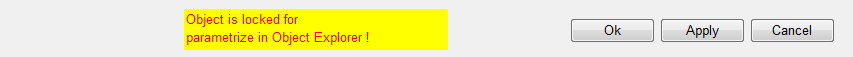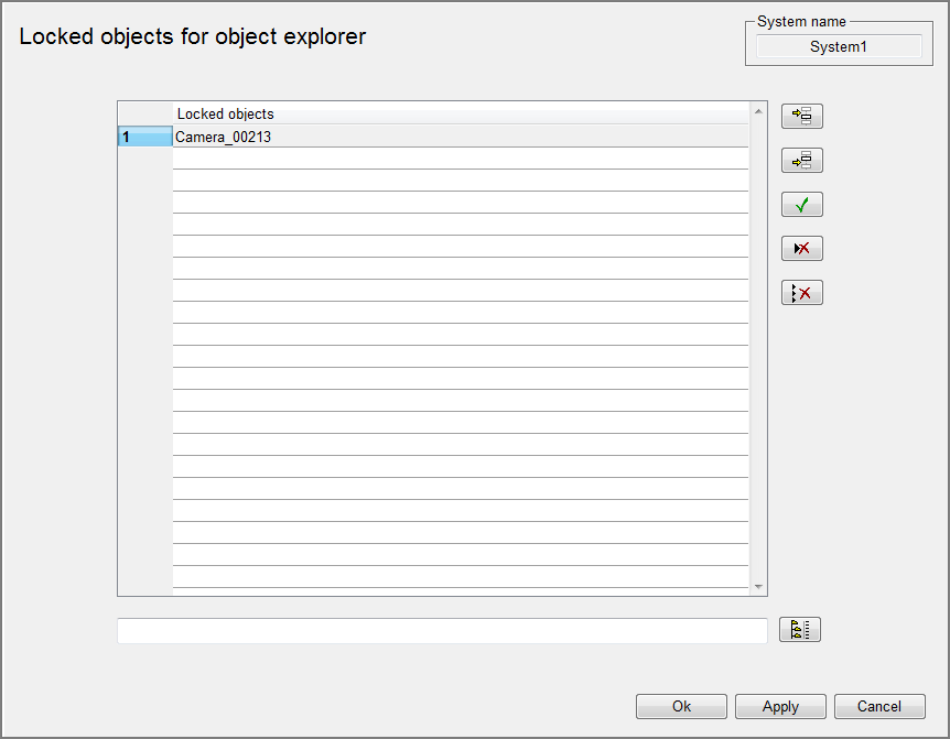This function can be used in order to ensure that special configurations are protected from unintentional changes. If an object is inserted into this list, the Apply and Ok button in the video object explorer of the particular object are replaced by a warning. The function can be bypassed via Common settings - internal settings in the system settings by selecting the function Allow configuration of locked objects (Bit 5) (see also Internal settings). There is still a warning in the video object explorer however the configuration is possible. There is no checking if the object which is in the list is existing in the system. If the video object is locked for the configuration, the lock is active for all systems. Buttons