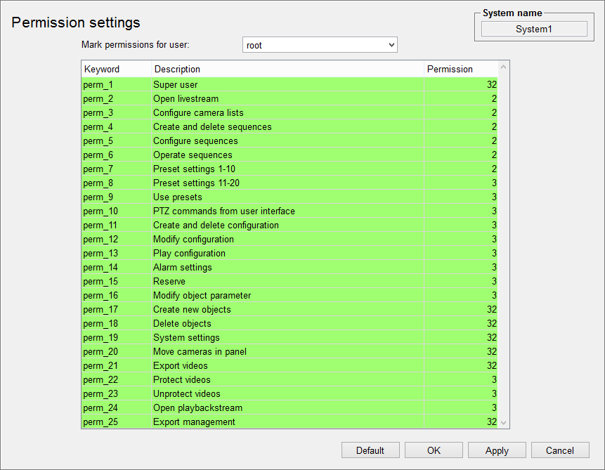 The WinCC OA video framework is divided into separate functional groups, each with specific functions. A user with the Superuser (perm_1) authorization can assign a permission bit (1-32) to each group.