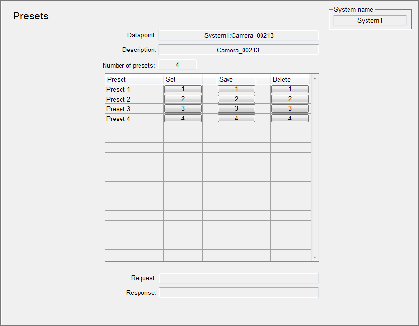 Presets can be triggered, set or deleted with this panel. The number of available presets depends on the configuration of the selected camera. The button "show live stream" displays the live stream and the PTZ control elements. The button "delete live stream" deletes the live streams and the PTZ control elements are hidden. |
