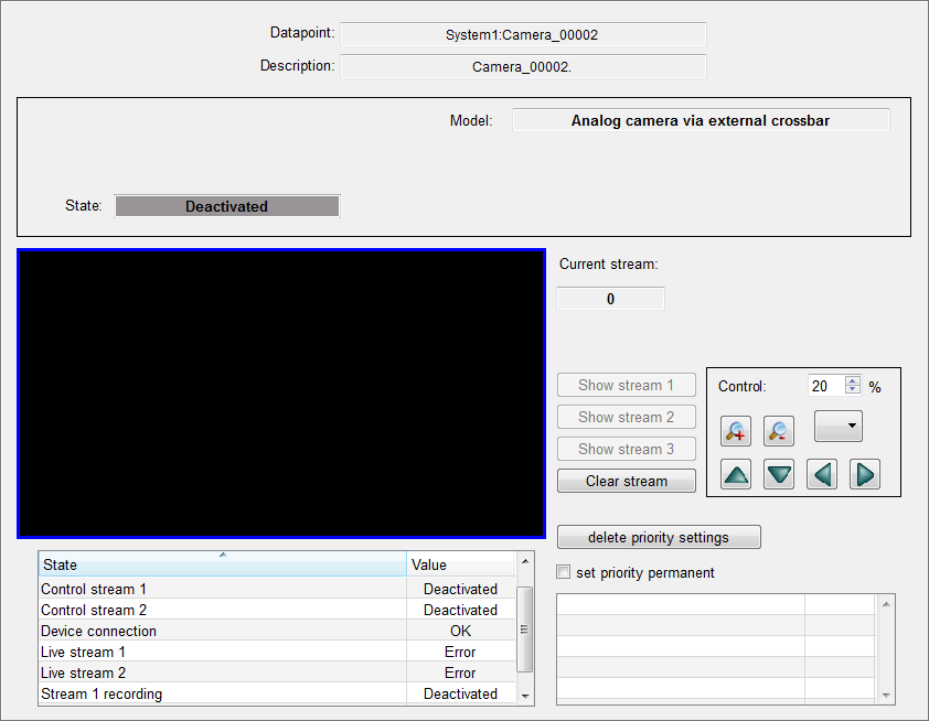 The priority can be set for each available stream of each available pool. The next camera is displayed via the selected pool and replaces an already opened camera with lower priority.