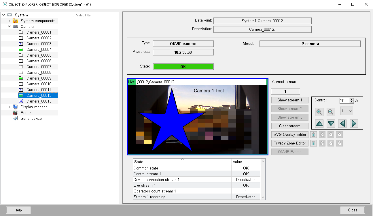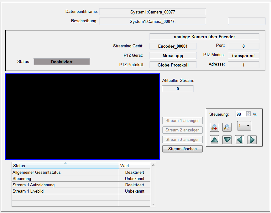The status information of cameras can be opened with a left mouse click on the appropriate camera object in the object explorer.