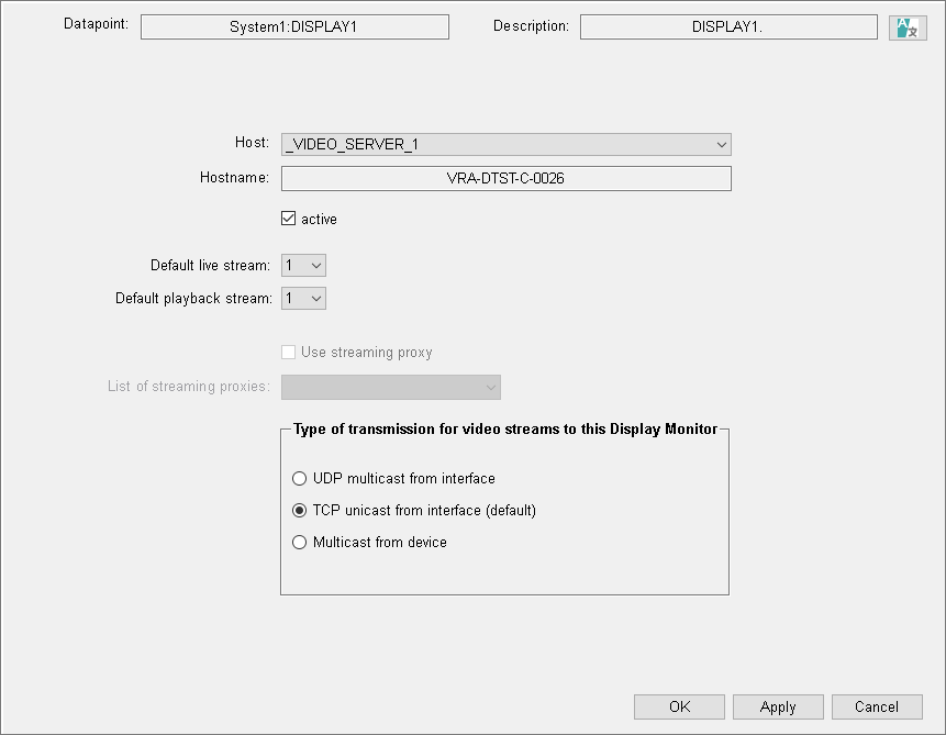 - The display monitor requests the stream via TCP unicast communication from the interface. In addition, transport=2 is written to ".object.device.definition" of the respective datapoint.