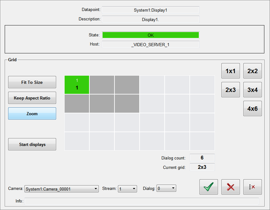 The opened stream is adjusted (with distortion) to fit to the size of the dialog. Keep Aspect RatioThe opened stream is shown in the dialog with the default size. ZoomThe opened stream is zoomed to the size of the dialog and keeps the aspect ratio. Start displaysStarts the displays which can be configured via the respective buttons (grid, dialog, camera). CameraWith this selection list you can choose between all created cameras. StreamDefines which stream is opened. DialogDefines on which dialog the selected stream is opened.