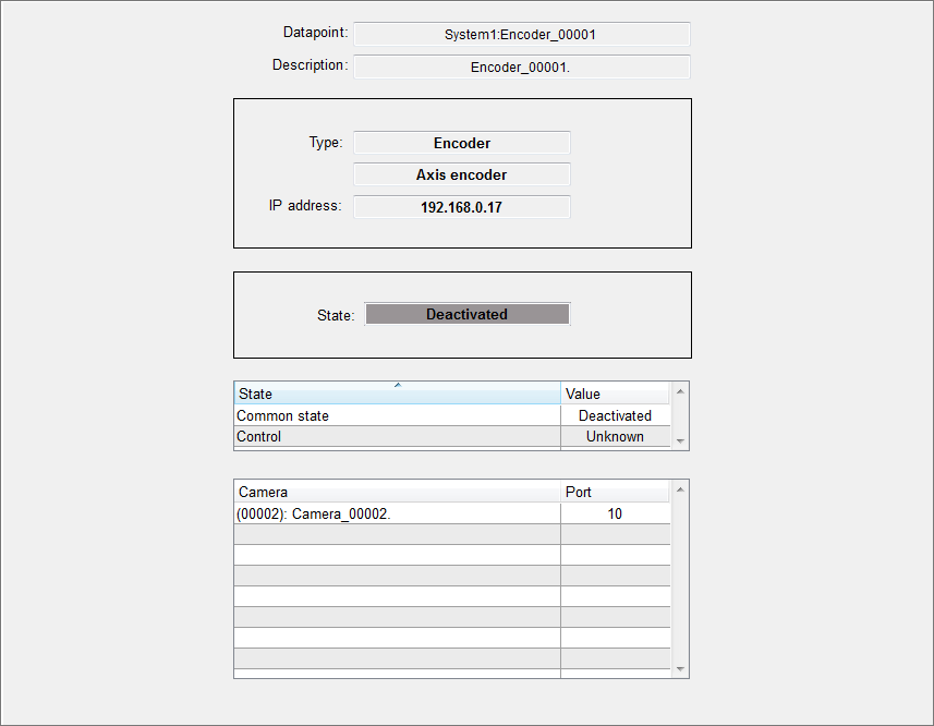 information about the type, IP address, state of the encoder, camera