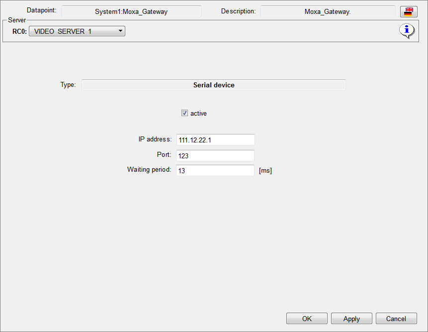 Activates/deactivates the serial device. IP addressIP address of the serial junction box. PortPort of the serial junction box. Wait timeDefines the minimum delay time (in milliseconds) between two commands to the serial device. This parameter is only necessary for devices that don't have enough internal puffer to prevent and would transmit incomplete data. Normally this is set to 0. |