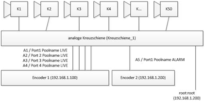 Every encoder supported by VIDEO OA can be used as pool encoder (e.g. Bosch, Axis, Moxa). The camera status depends on the status of the crossbar connection. E.g. if the control connection to the crossbar is disrupted, the status of all related cameras is disrupted as well. Example