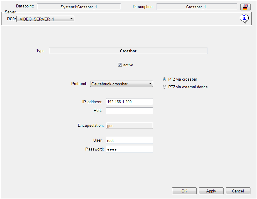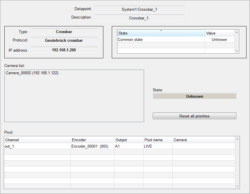 Defines if the crossbar can process PTZ commands for the connected cameras PTZ via external deviceIf this option is set, an external device must be configured for the PTZ control of the camera OverviewThis panels shows the configuration of the crossbar. It displays the type, protocol, IP address, status as well as connection between encoder, crossbar and encoder pool channels.