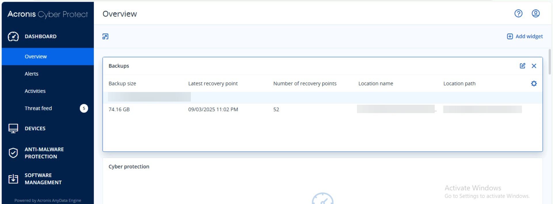 Acronis Dashboard – Verwaltungsübersicht