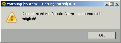 Versucht ein Benutzer eine der Meldungen zu quittieren, die nicht die älteste dieses Datenpunktelements ist, muss zuvor die älteste quittiert werden. Dazu wird ein Dialog aufgeschaltet (siehe Abbildung unten).