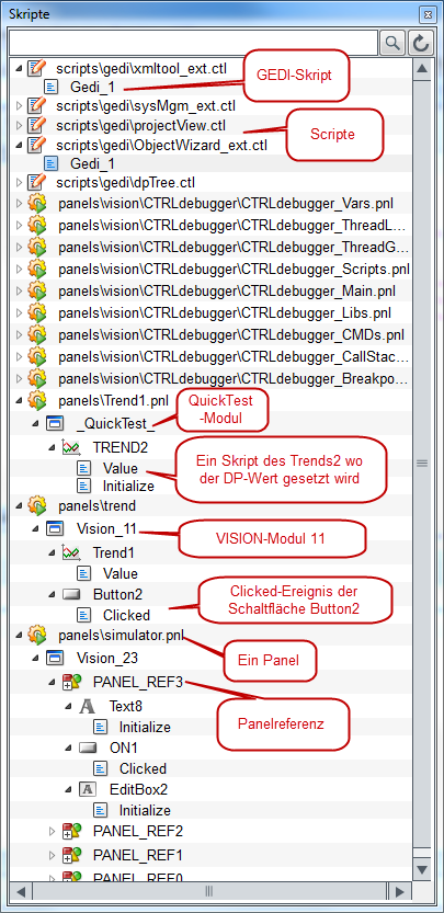 Um ein Script zu ändern, doppelklicken Sie auf ein Script rechts oben im Infofenster des CTRL-Debuggers und das Script wird im Script Editor geöffnet. Editieren Sie das Script direkt in der Originaldatei. Das gleiche gilt für Panels, doppelklicken Sie auf einen Panelnamen, um das Panel im GEDI zu öffnen (siehe Abbildung oberhalb).