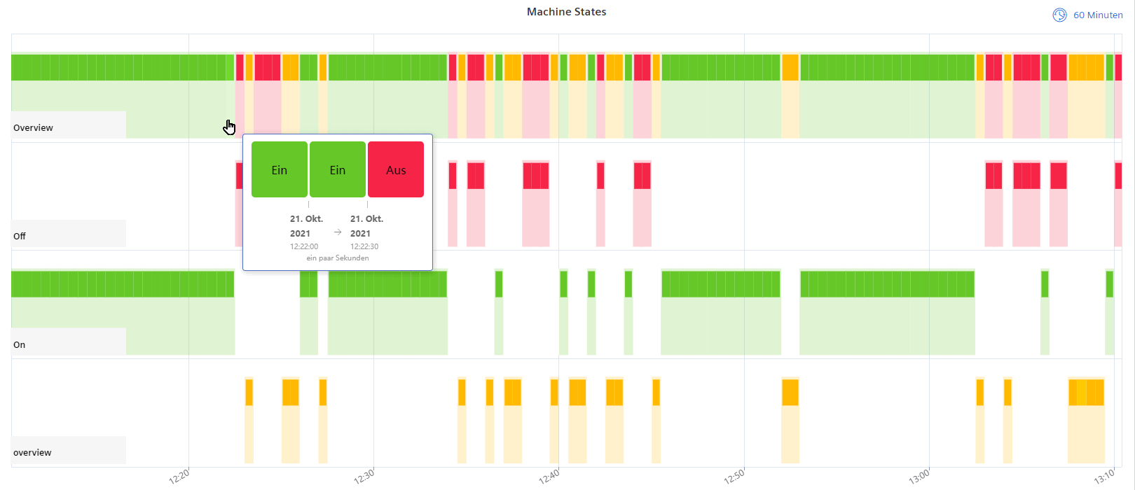 Das Gantt Chart stellt eine zeitintervall-basierte Ansicht des Datenpunktwerts zur Verfügung. Die Breite jedes Balkens repräsentiert die Zeitspanne in welcher ein bestimmter Wert vorhanden war.