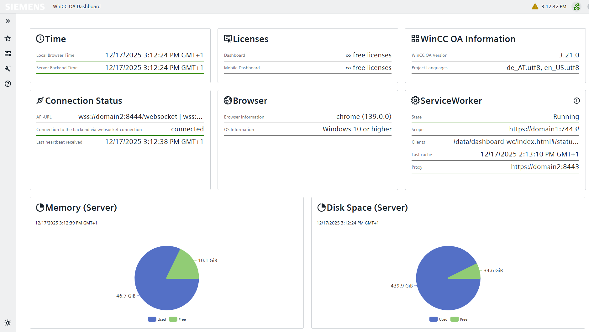 Dieser Bereich bietet Informationen über die aktuell im Produkt verwendete WinCC OA-Version und die verfügbaren Projektsprachen. Diese Informationen sind entscheidend, um Kompatibilitätsprobleme schnell zu analysieren.