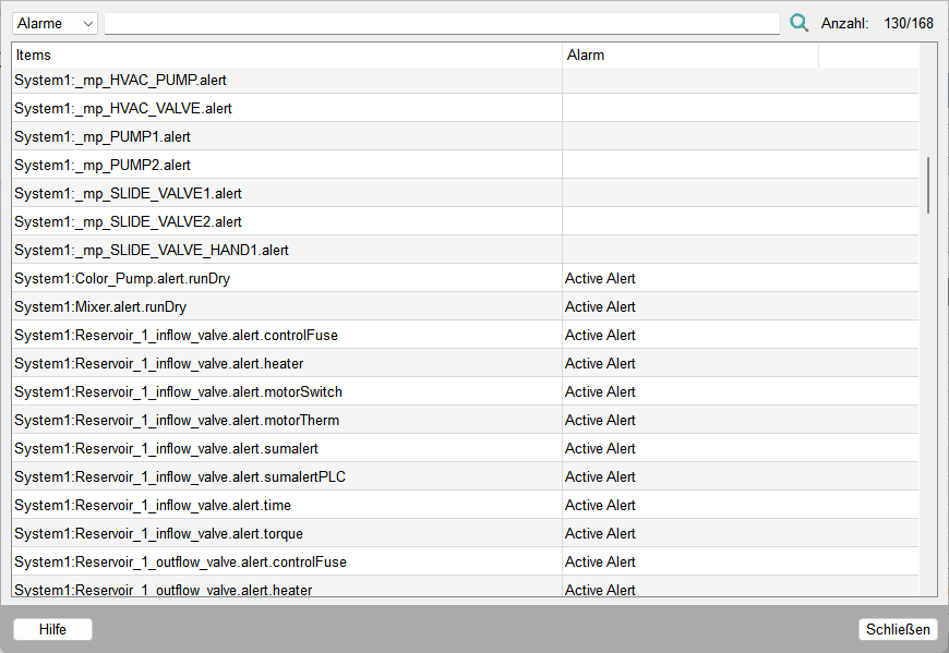 Durch Auswahl von Alarme ändert sich die Anzeige des Panels und es wird dargestellt, welches Element im System eine konfigurierte aktive oder inaktive Meldebehandlung besitzt. In der rechten oberen Ecke dieses Panels wird die Anzahl der konfigurierten Alarme (aktive und inaktive) im Verhältnis zur Gesamtanzahl der Elemente in der Gruppe angezeigt.