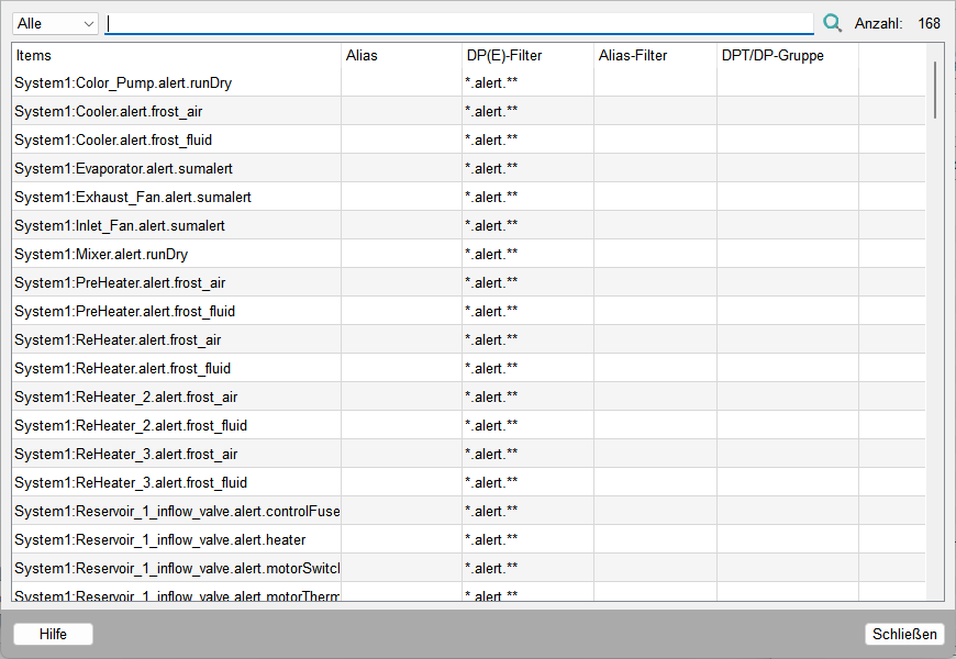 Mit der Schaltfläche Prüfen> öffnet sich ein Panel, in dem alle in einer Gruppe enthaltenen Datenpunkte bzw. Datenpunktelemente angezeigt werden.