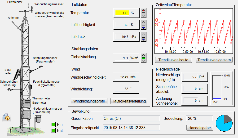 Während die meisten Messdaten automatisch ins System gelangen, müssen Bewölkungsgrad und Klassifizierung händisch eingegeben werden. Dabei sind Spontaneingaben (für den aktuellen Zeitpunkt) sowie Eingaben zu den festen Ablesezeitpunkten möglich.