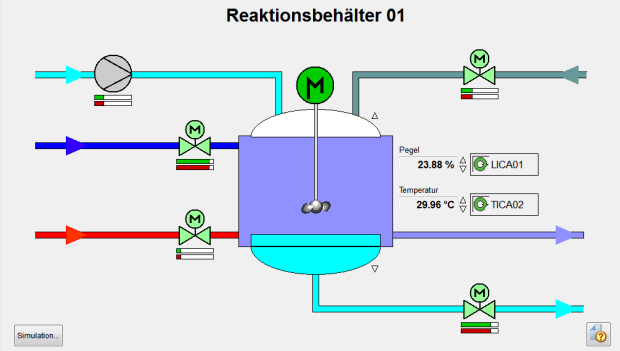 Der flexibel verwendbare Reaktionsbehälter kann sowohl für endotherme wie auch für exothermeReaktionen inklusive notwendiger äußerer Stabilisierung eingesetzt werden. Die Temperatur des Reaktorinhalteswird permanent gemessen und durch das Rührwerk M1 im gesamten Volumen als annähernd gleich angenommen. Die Gewährleistung einer prozessbedingten Solltemperatur erfolgt durch Regelung der beiden Vorlaufventile für den Zustrom von Heiz- und Kühlmedium (V2, V3). Die Temperaturregelung wirkt direkt auf das Ventil V2, wobei in der Steuerung für V3 jeweils der inverse Stellgrad erzwungen wird (z.B. V2 = 80 % geöffnet -> V3 = 20% geöffnet).