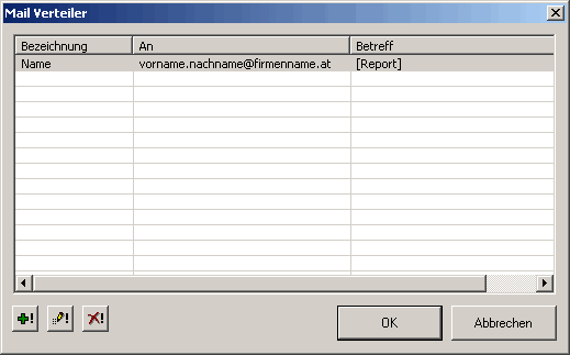 Durch die Definition der Mail Verteiler besteht für den Benutzer des Reports die Möglichkeit, Protokolle per Mail zu verschicken. Das erstellte Protokoll wird als Anhang dem Mail beigefügt. Die folgende Abbildung zeigt einen definierten Mail Verteiler: