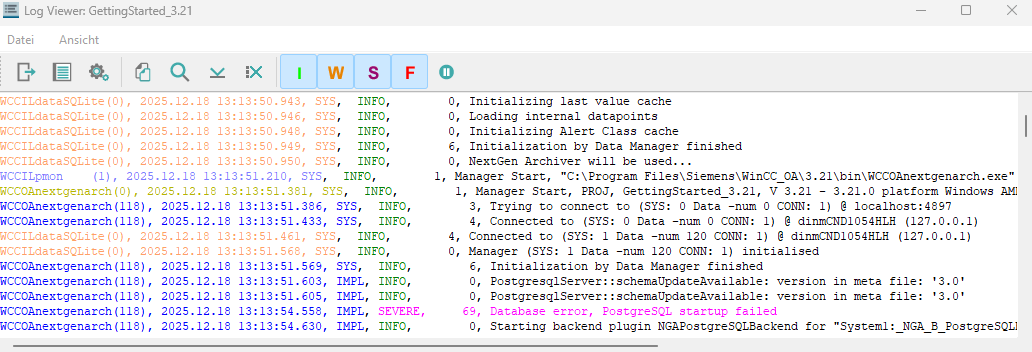 Aus Sicht des Benutzers ergeben sich zunächst folgende relevante Schnittstellen - die Aufzählung erfolgt verständnisorientiert, ohne Rücksicht auf die strenge Manager-Architektur. B ei einem typischen Projektablauf (hier am Beispiel des Projekts GettingStarted_3.21) kommt es zu den folgenden Interaktion mit dem Benutzer: Nach dem Start von WinCC OA öffnet sich die Projektadministation und nach starten des Projekts öffnet sich die Konsole gefolgt vom „Log Viewer“