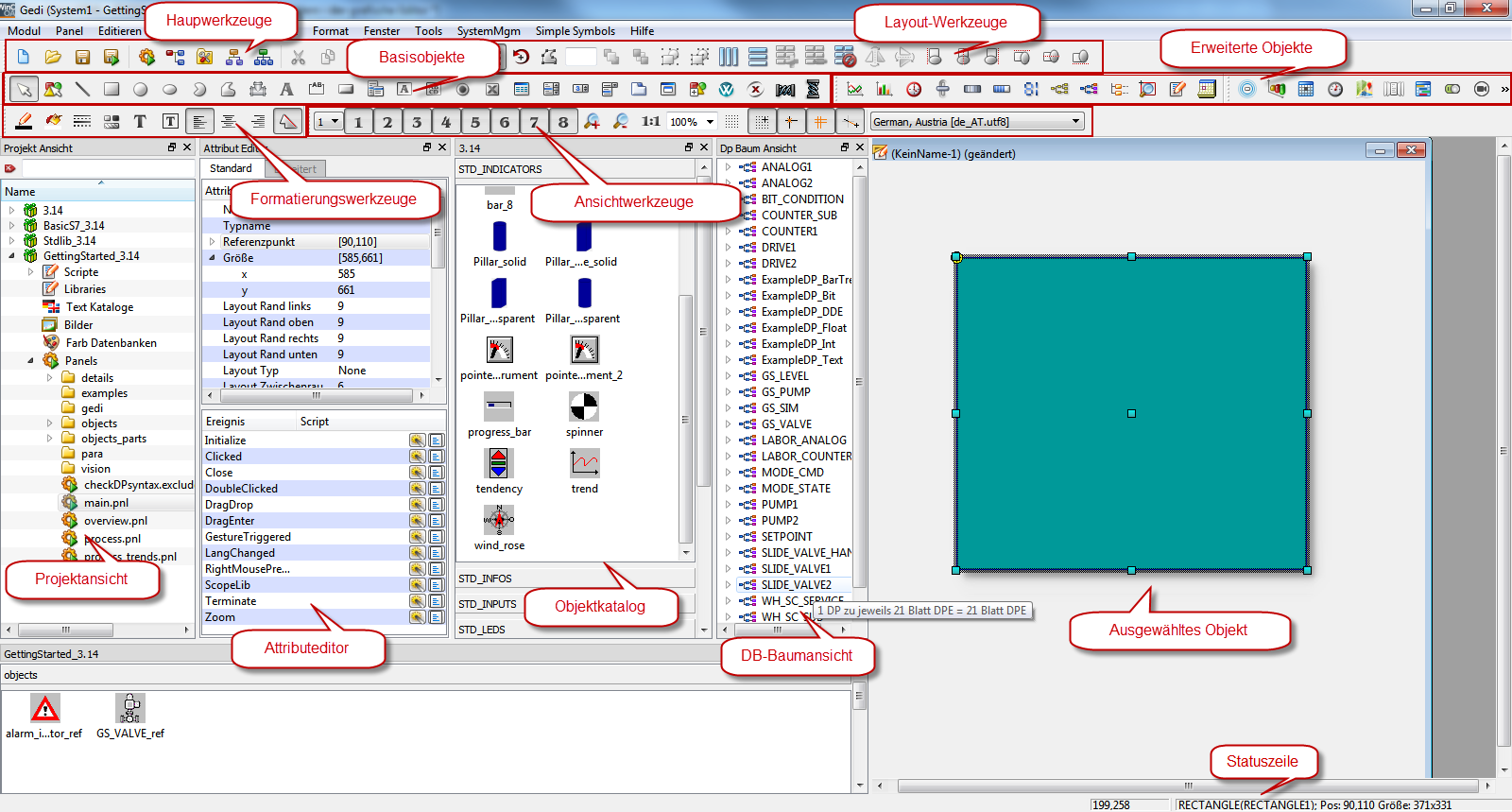 werden. Symbolleisten und andere Ansichten innerhalb des GEDI sind als verankerbare