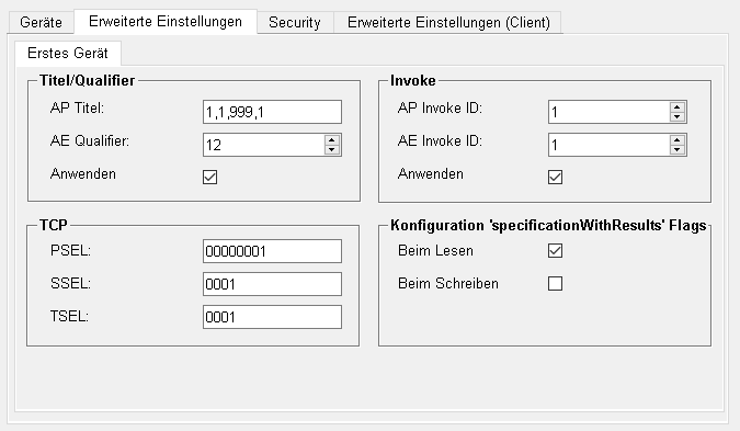 Der Wert von AP Titel soll gemäß dem für OSI Objektbezeichner definierten Format (www.oid-info.com) angegeben werden. Erlaubte Zeichen sind die Zahlen 0 bis 9 und Komma (,), wobei maximal 8 Kommas angegeben werden dürfen. Wird das Feld leer gelassen, werden keine Parameter übertragen (siehe Hinweis unten).