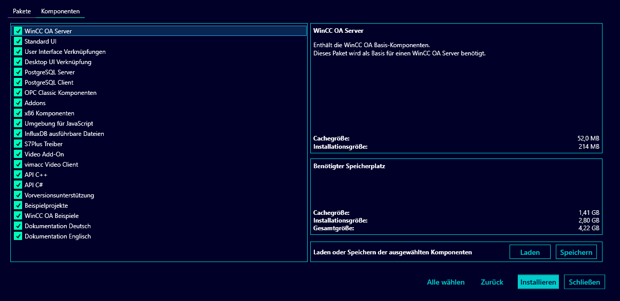 Im mittleren Bereich wird der gesamte Speicherplatz berechnet, der für alle ausgewählten Komponenten benötigt wird. Die jeweiligen Cache- und Installationsgrößen werden zur Verdeutlichung ebenfalls angegeben.